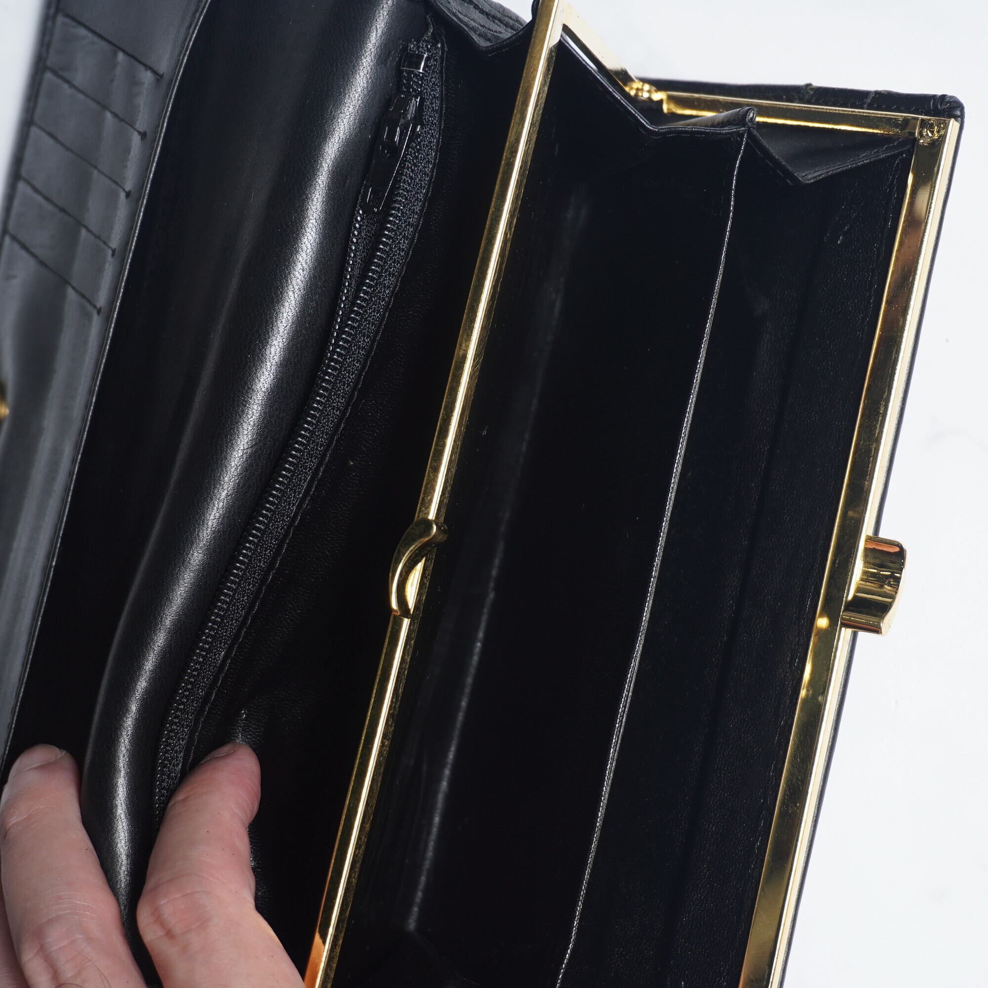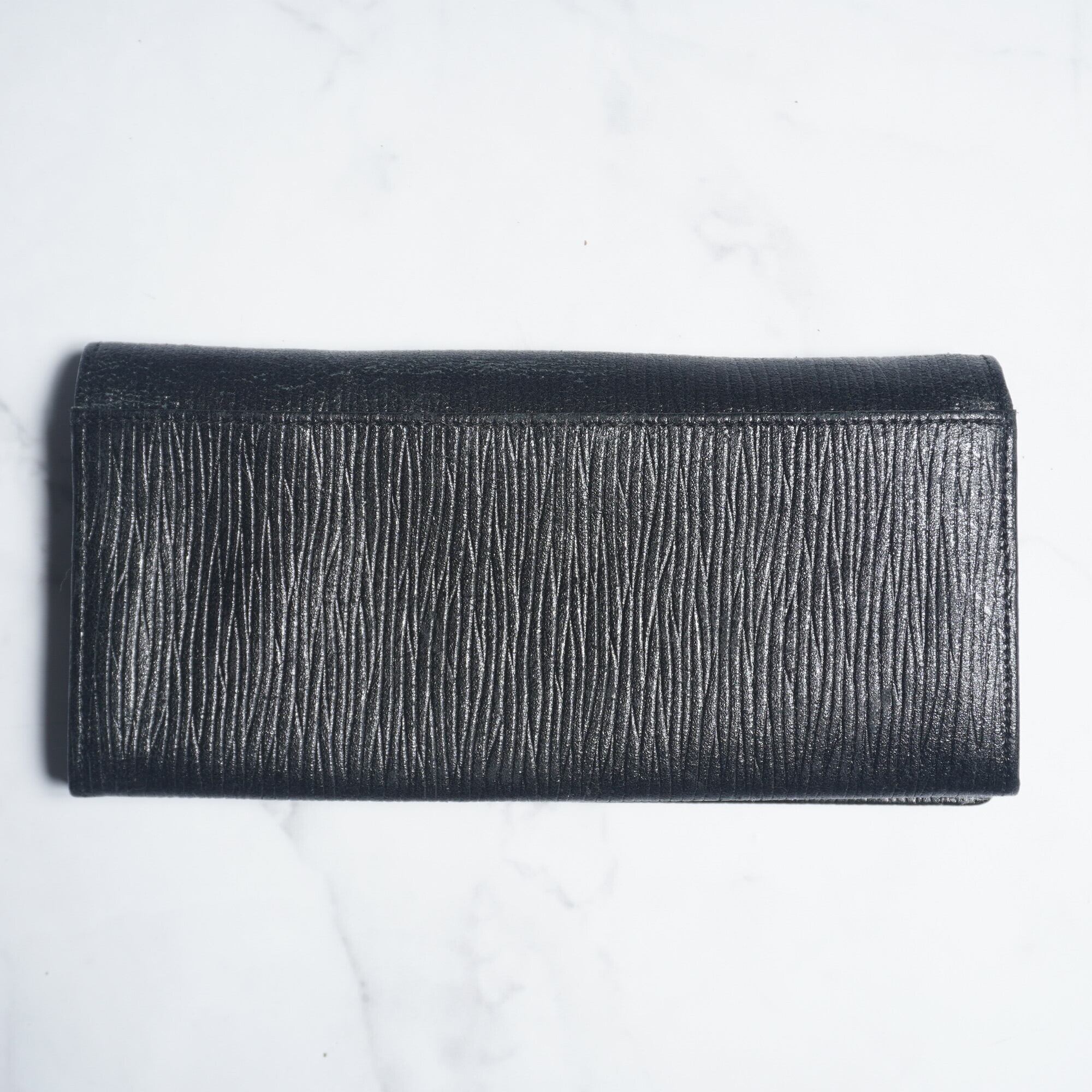 この長財布は、クラシックな「がま口」デザインに現代的なエッセンスを加え、ラグジュアリーファッションの新たな境地を切り開いています。フロントに配置された光沢のあるロゴプレートは、控えめながら存在感があり、ブランドの誇りと品格を静かに主張します。