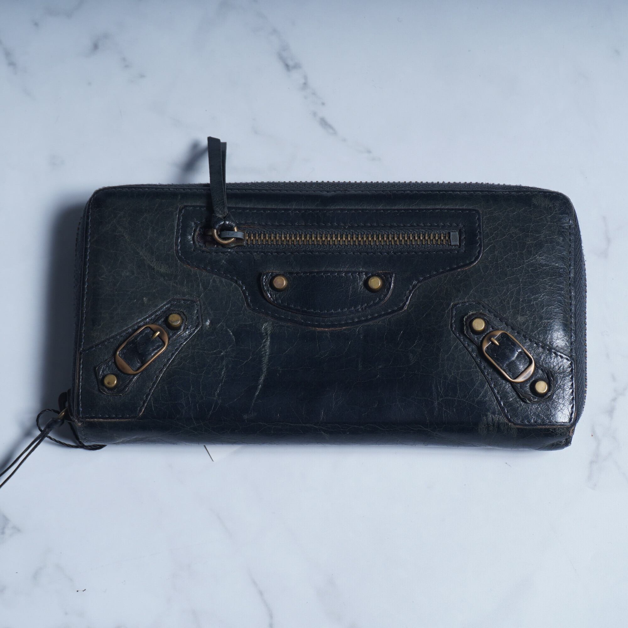 バレンシアガのレザー素材の長財布。レザーに加え、フロント部分のジップをはじめとした装飾が渋さを引き出しており、昨今ファッション界を席巻しているバレンシアガの奇抜さとはまた異なる良さが表現されている一品です。