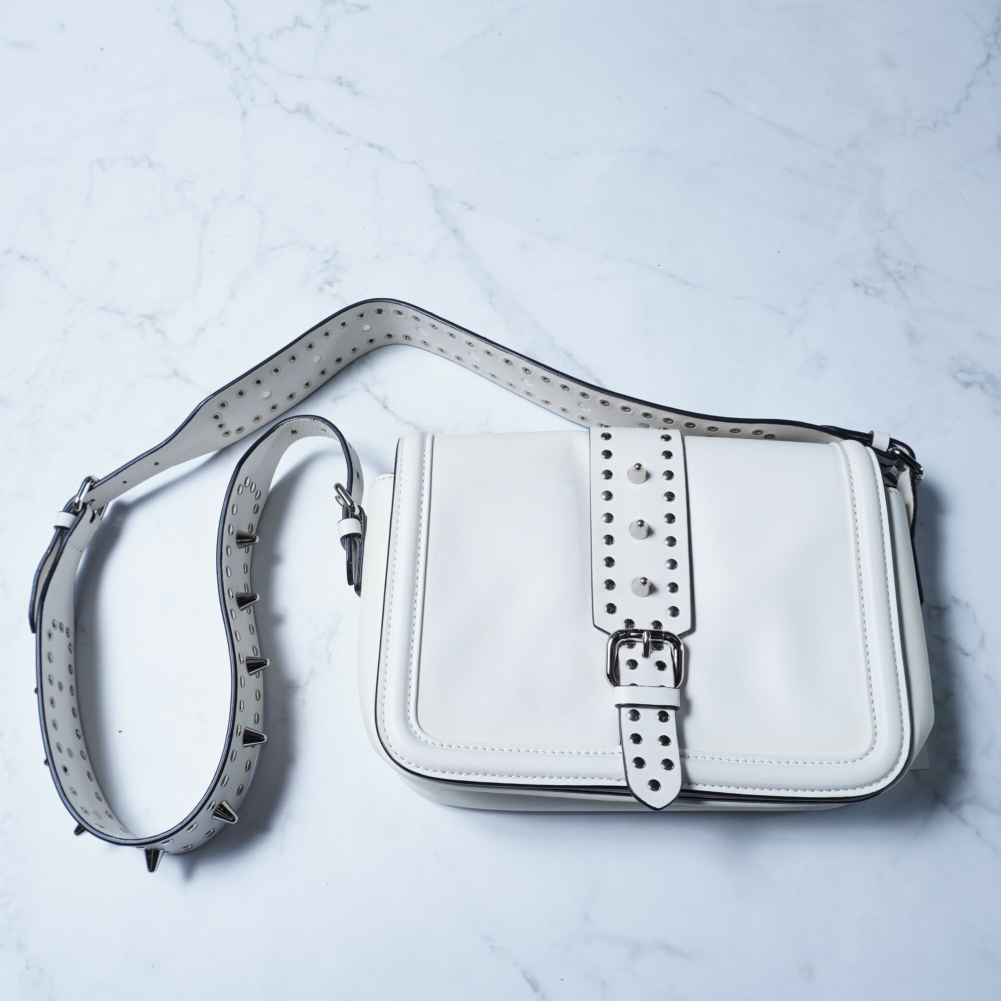ホワイトのレザー素材に、スタッズがアクセントとして施されており、シンプルながらもエッジの効いた印象を与えます。スタッズの配置はバランスよく、クラシックな中にもモダンさが感じられます。