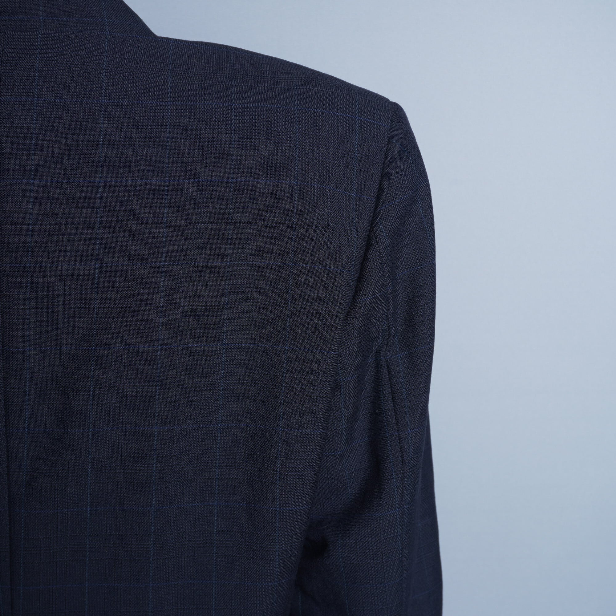 伝統的なダブルブレストのジャケットと、スタイリッシュなチェック柄が特徴的なテーパードパンツのセットアップ。チェック柄が上品でありながら、トラディショナルな印象を与えつつも現代的なアプローチが施されています。ジャケットはラグジュアリーでありながらも、シャープでモダンなシルエットが魅力です。