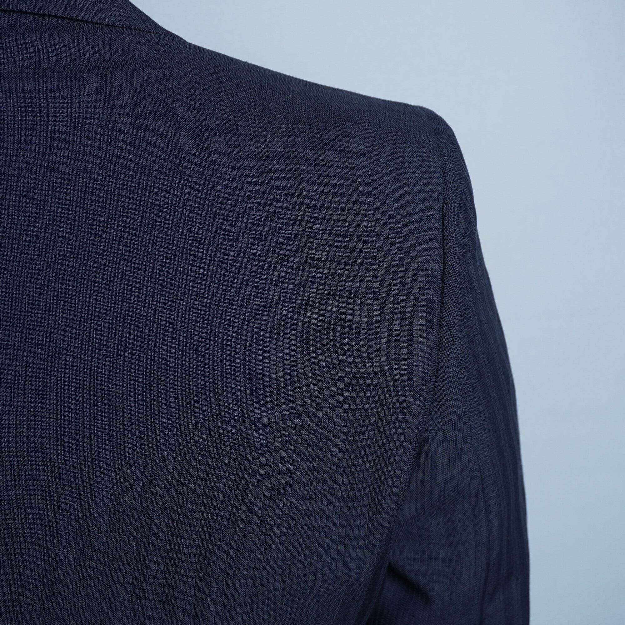 繊細に施されたストライプは、光の角度によって表情を変える深みのあるネイビーカラーと相まって、品格と気品を醸し出します。英国らしい伝統的なテイラリングの技法を継承しながら、モダンなエッセンスを加えた絶妙なバランスが光ります。