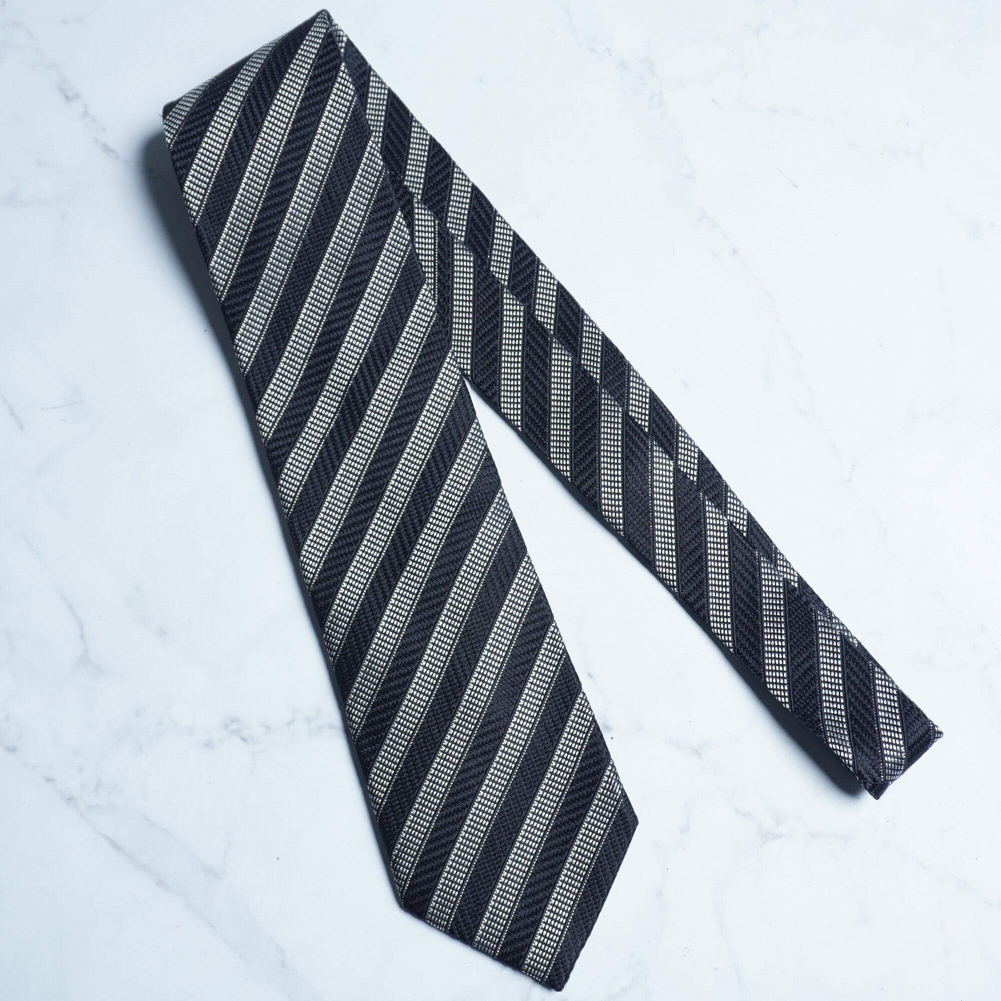 イタリア製のストライプ柄ネクタイ。黒地に白とシルバーのストライプで一際目立つ印象があります。下地の色ではなく、ストライプの織りで存在感を放つネクタイは多くなく希少性も高いかと思います。