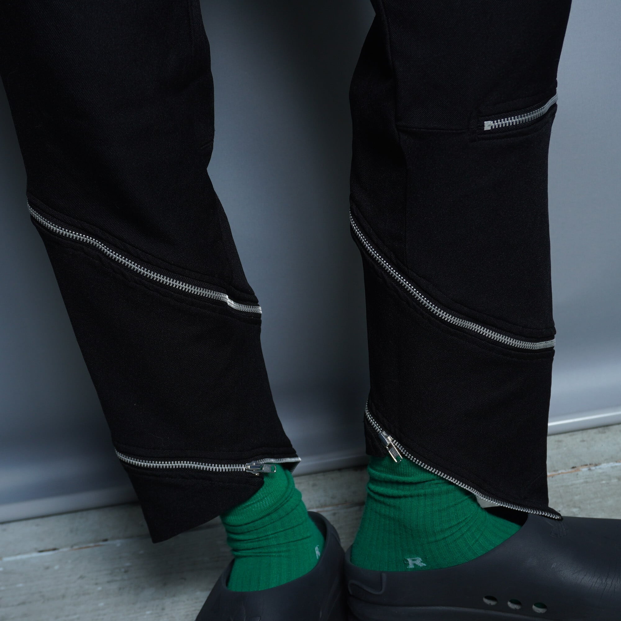 ブラックの深遠なる美学を体現した、コムデギャルソンならではの螺旋スパイラルZIPパンツ。一見シンプルな黒パンツながら、膝下から裾にかけて施された螺旋状のジッパーデザインが、モードの反骨精神を表現しています。