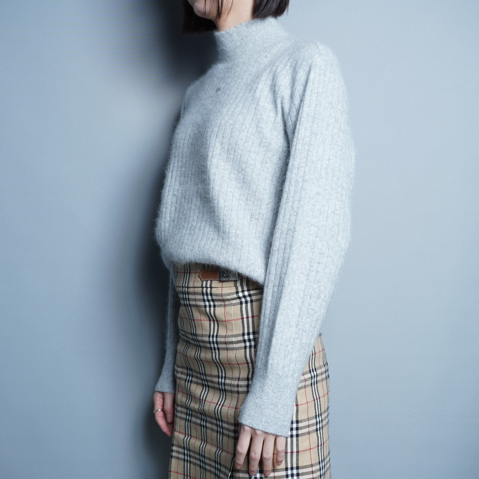 毛足の長いアンゴラが40%程配合されており、非常に柔らかい印象を受けるニットセーター。毛足の長いウールと相性の良いナイロンも入っていいるため、肌触りも滑らかな一着。