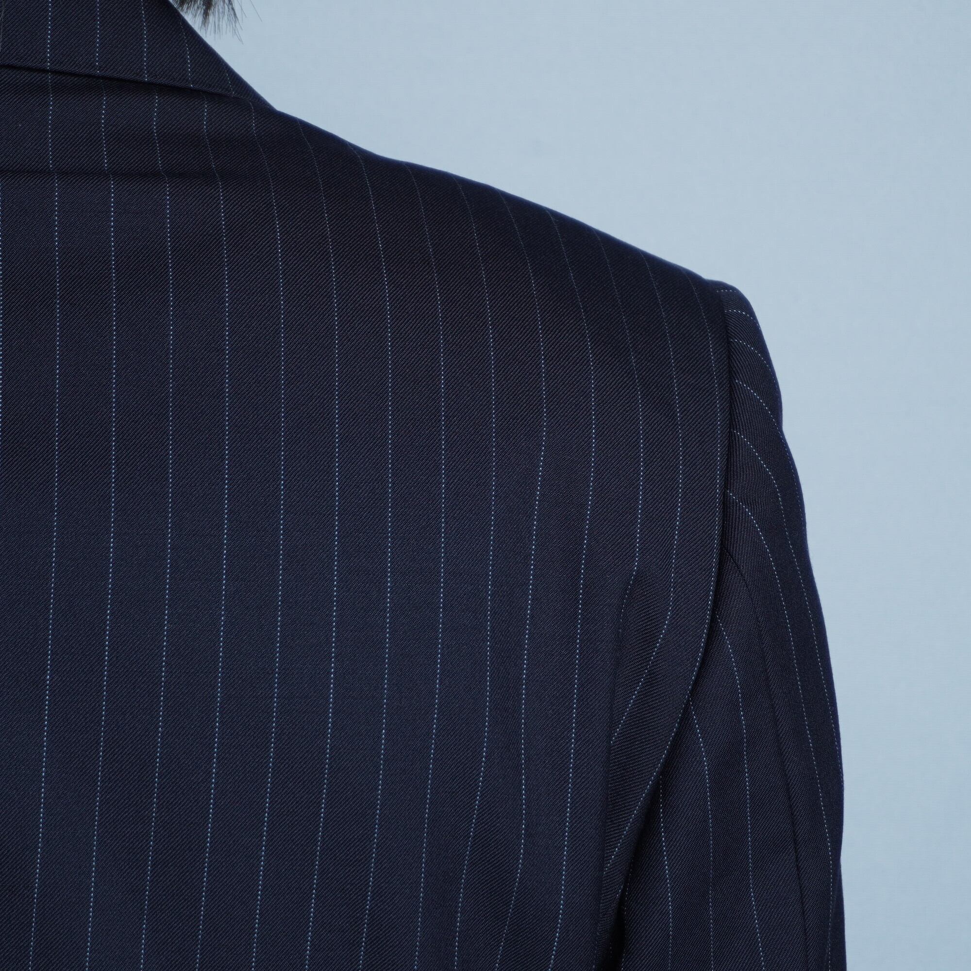バーバリーのシングルボタンセットアップ。ブラックのボディにブルーのストライプがエレガントな印象を与え、ビジネスシーンやフォーマルな場面でも大活躍する一着です。