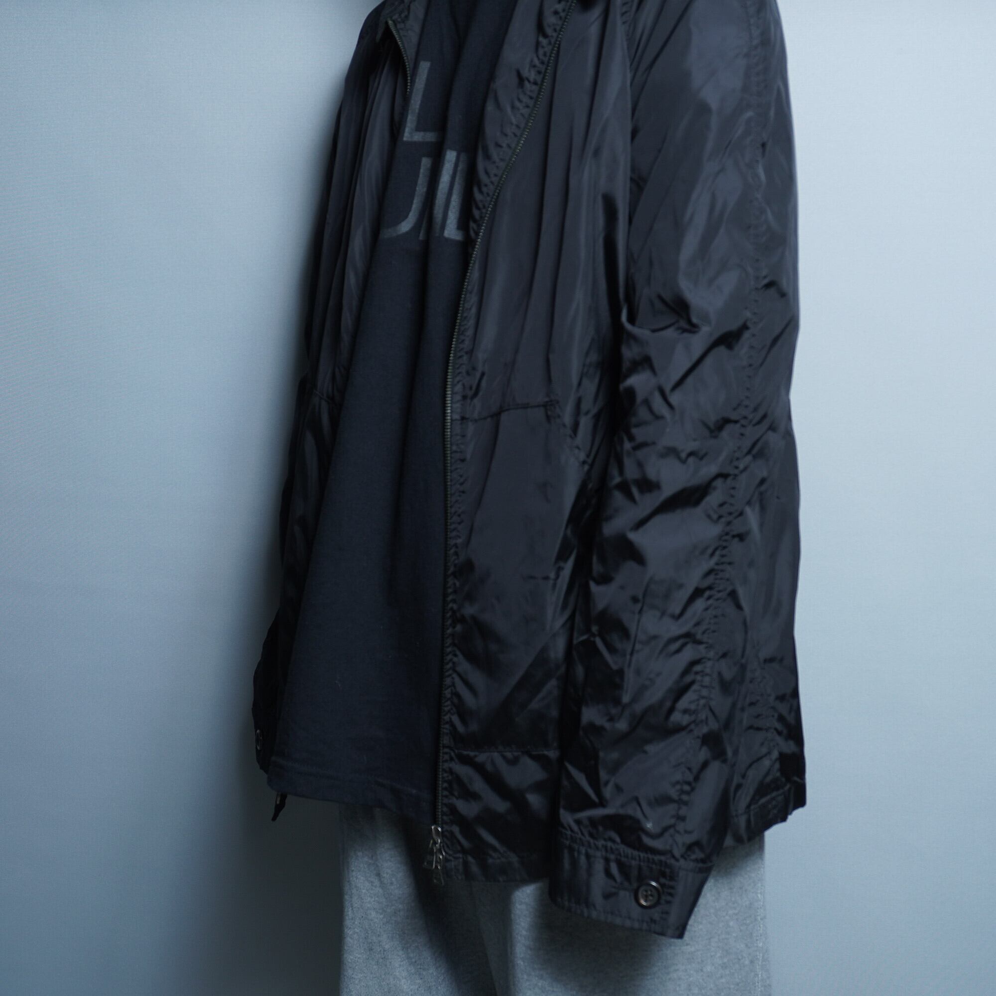 軽量ナイロン素材を使用し機能性に優れた一着。袖はボタン留めになっており、シャツのような感覚で着用できるため日常のコーディネートに取り入れやすいデザインが特徴。ダブルジップ仕様でカジュアルからスポーティまでスタイリングの幅が広がりること間違いなし。