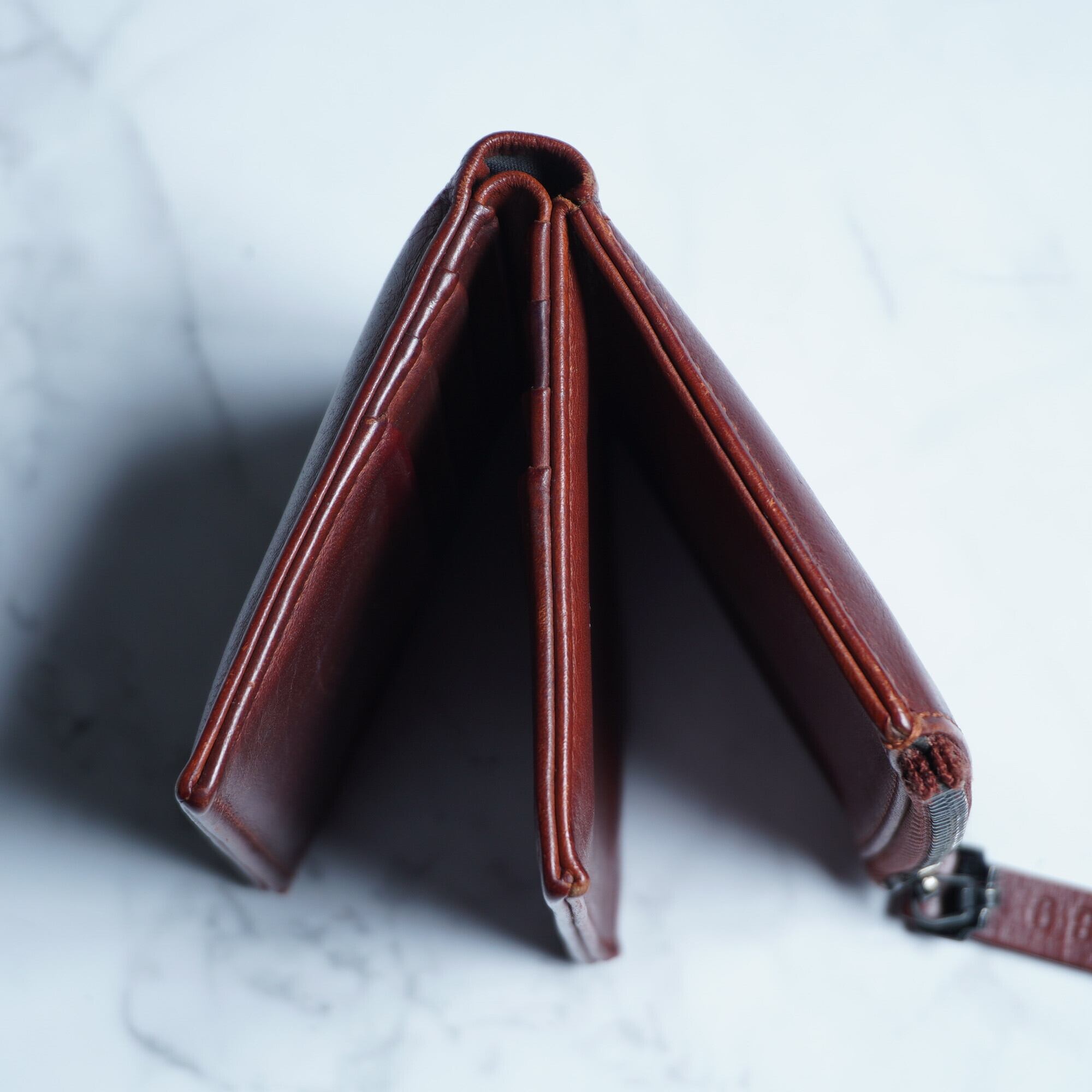 マルジェラの二つ折り財布。定番デザインの四つタグにあまり見かけないカラーが特徴的な一品。ワインレッドとブラウンの間のようなカラーで渋さと上品さが共存した大人らしいアイテムとなっているのでぜひ。