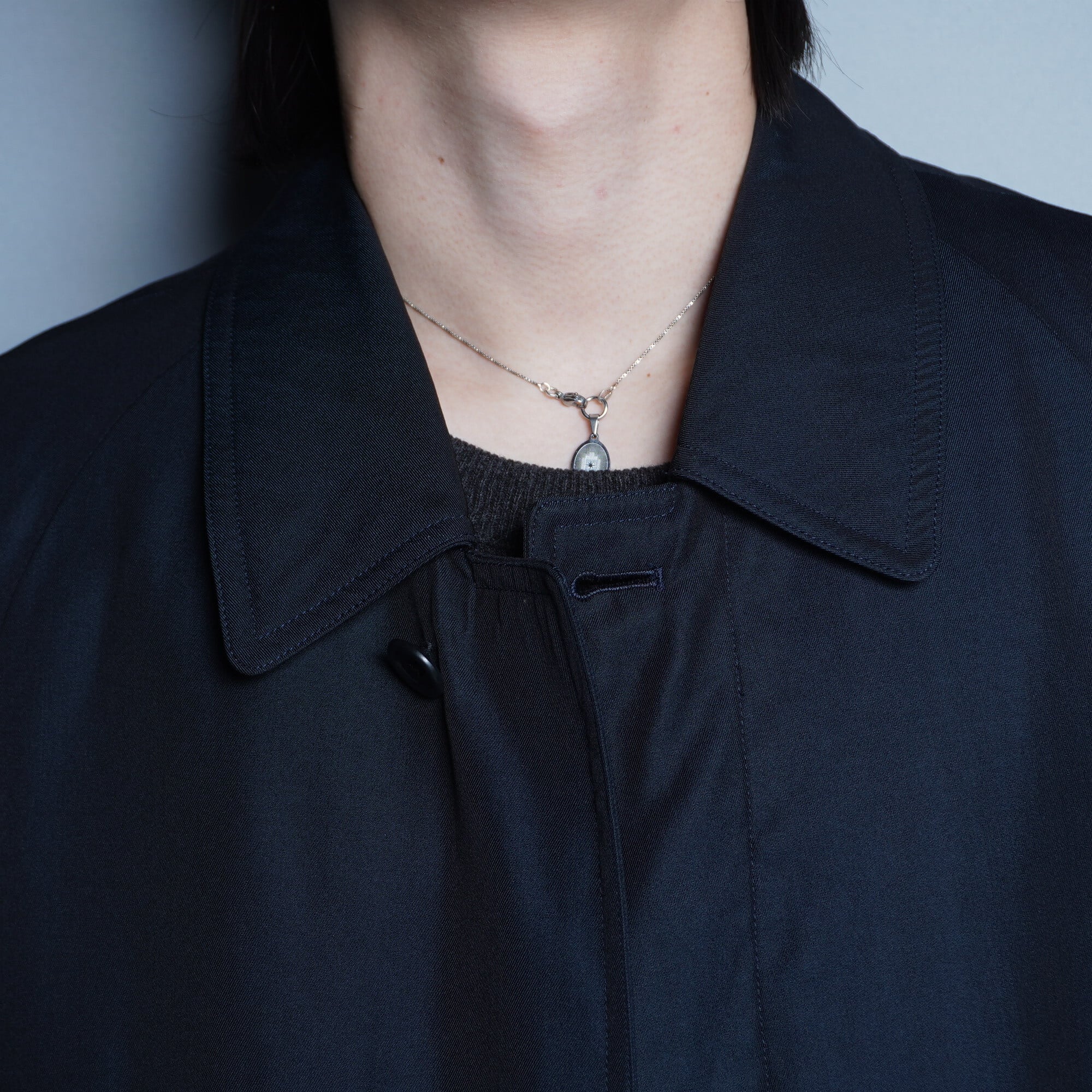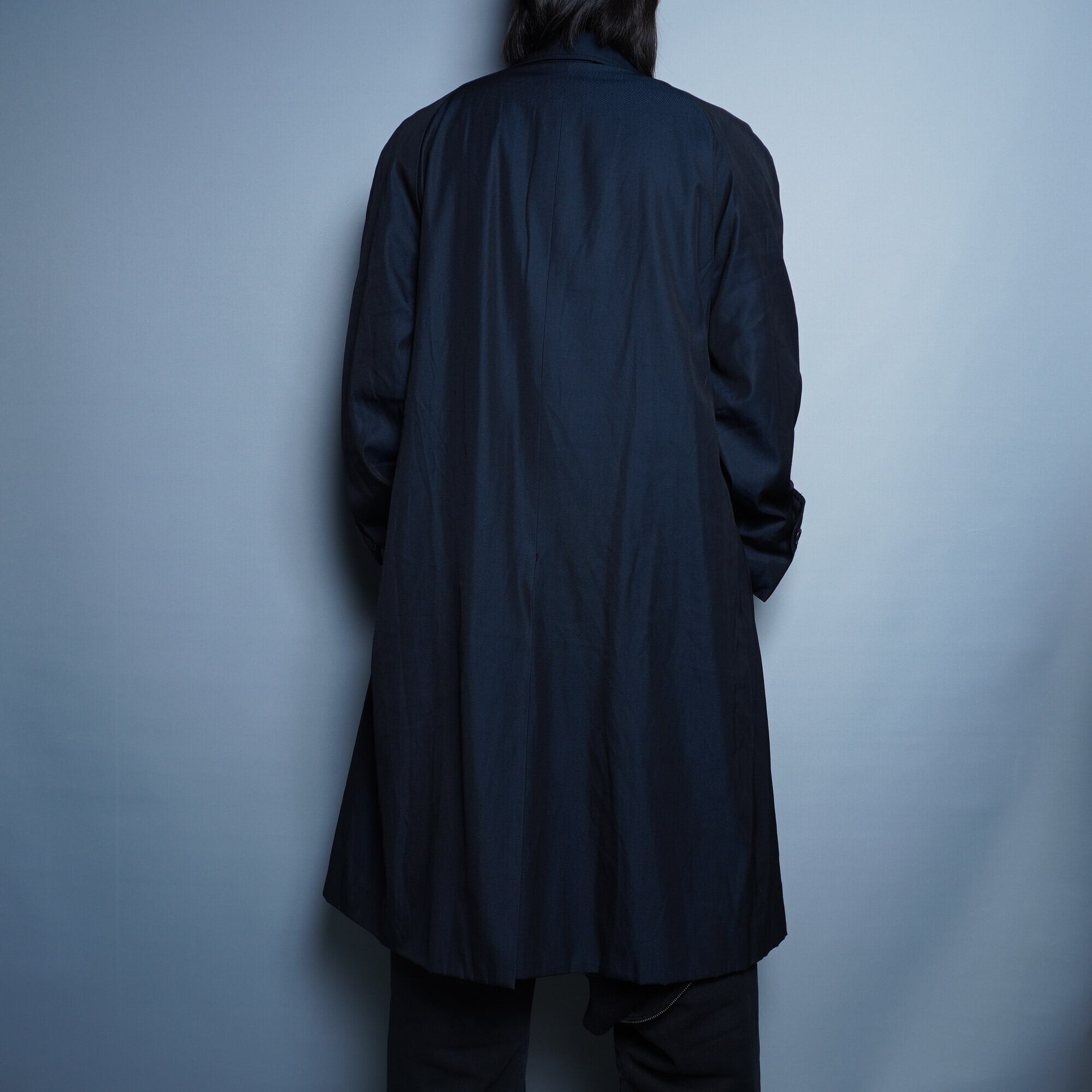 玉虫色の輝きを放つネイビーのバルマカンコートです。クラシックなデザインにモダンな魅力を融合させた、唯一無二の一着となっています。