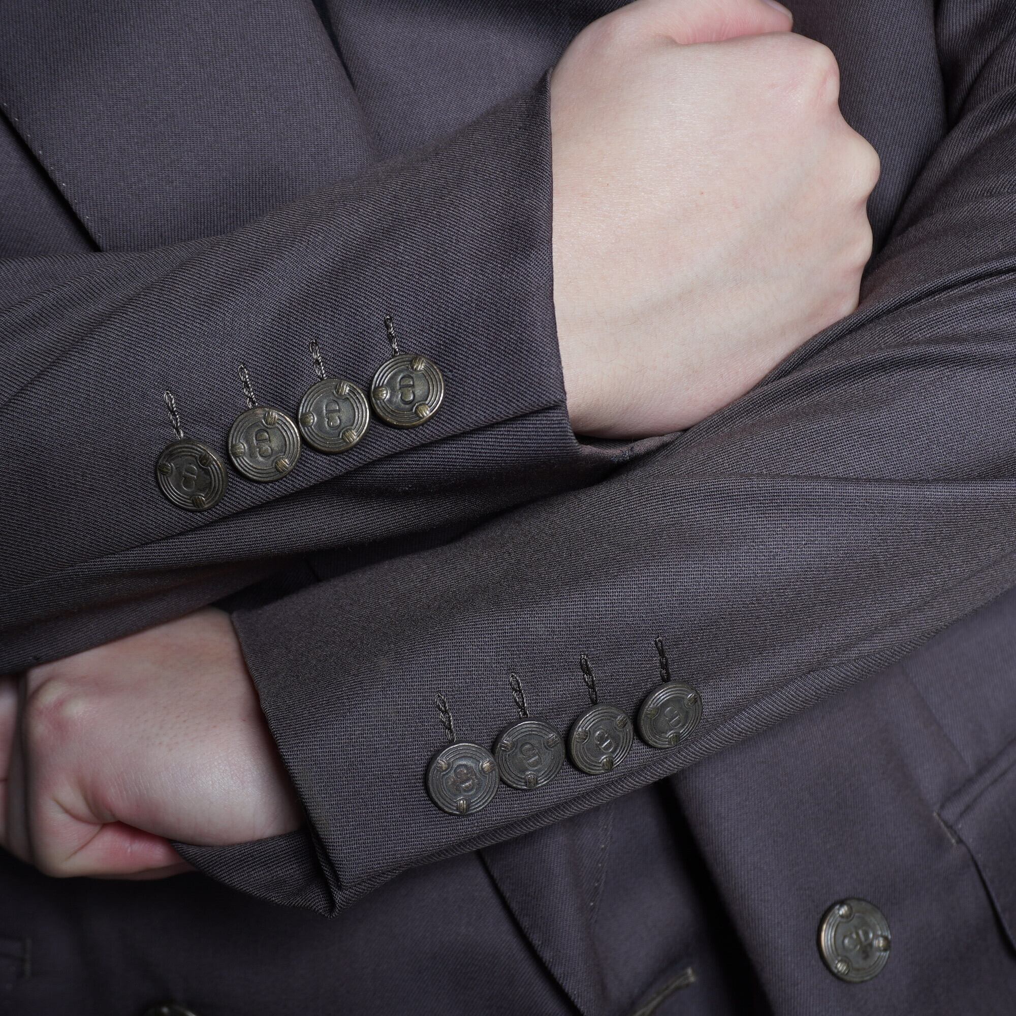刻印の入ったメタルボタン×グレーブラウンの非常に上品なダブルセットアップ。ピークドラペルとダブルのテーラードで雰囲気のある一着。
