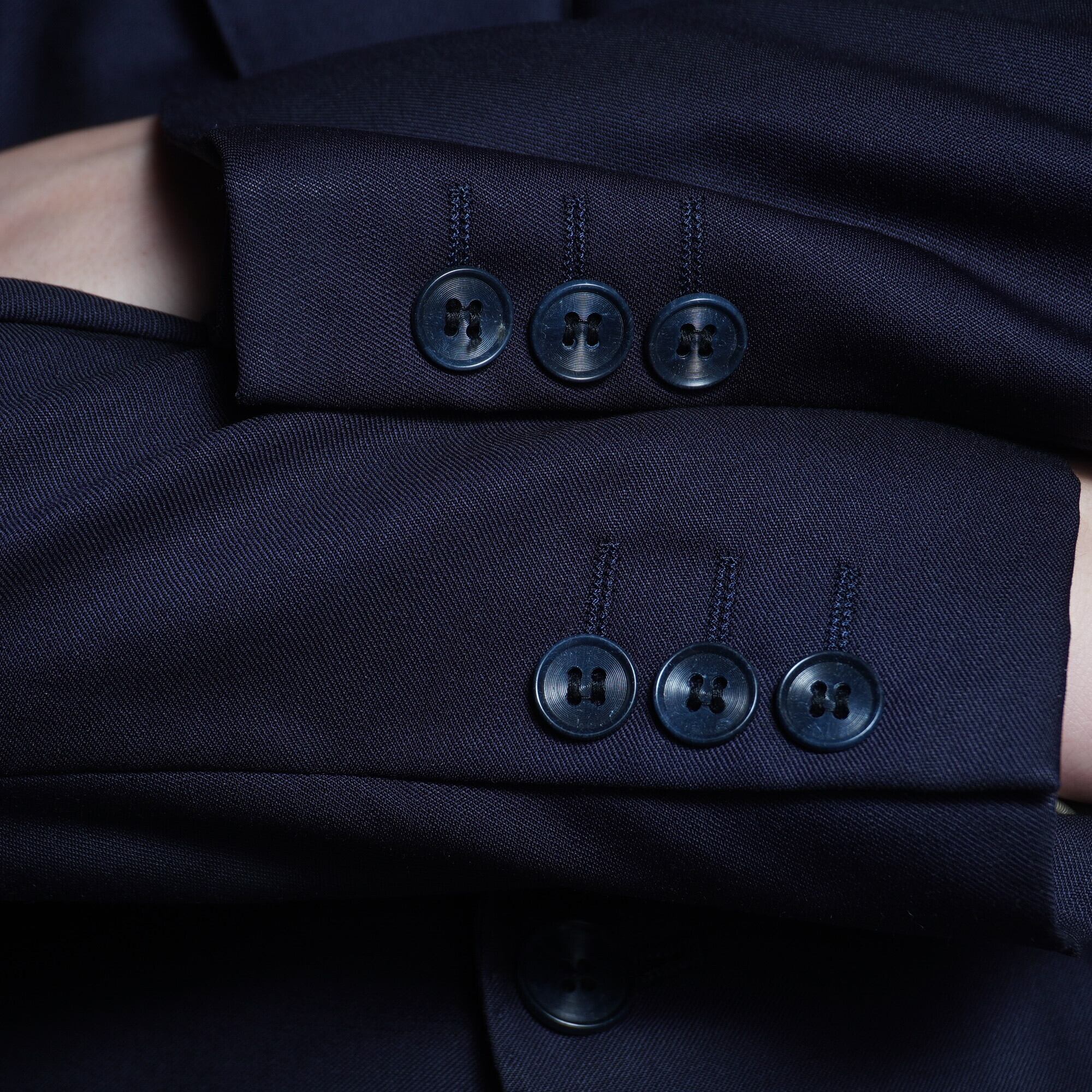 ジャケットは、流行に左右されない2ボタンスタイルを採用。肩のラインから裾にかけての絶妙なシルエットワークが、スマートで知的な印象を演出します。適度な重みのある生地使いと繊細な縫製技術により、美しいドレープ感を実現しています。