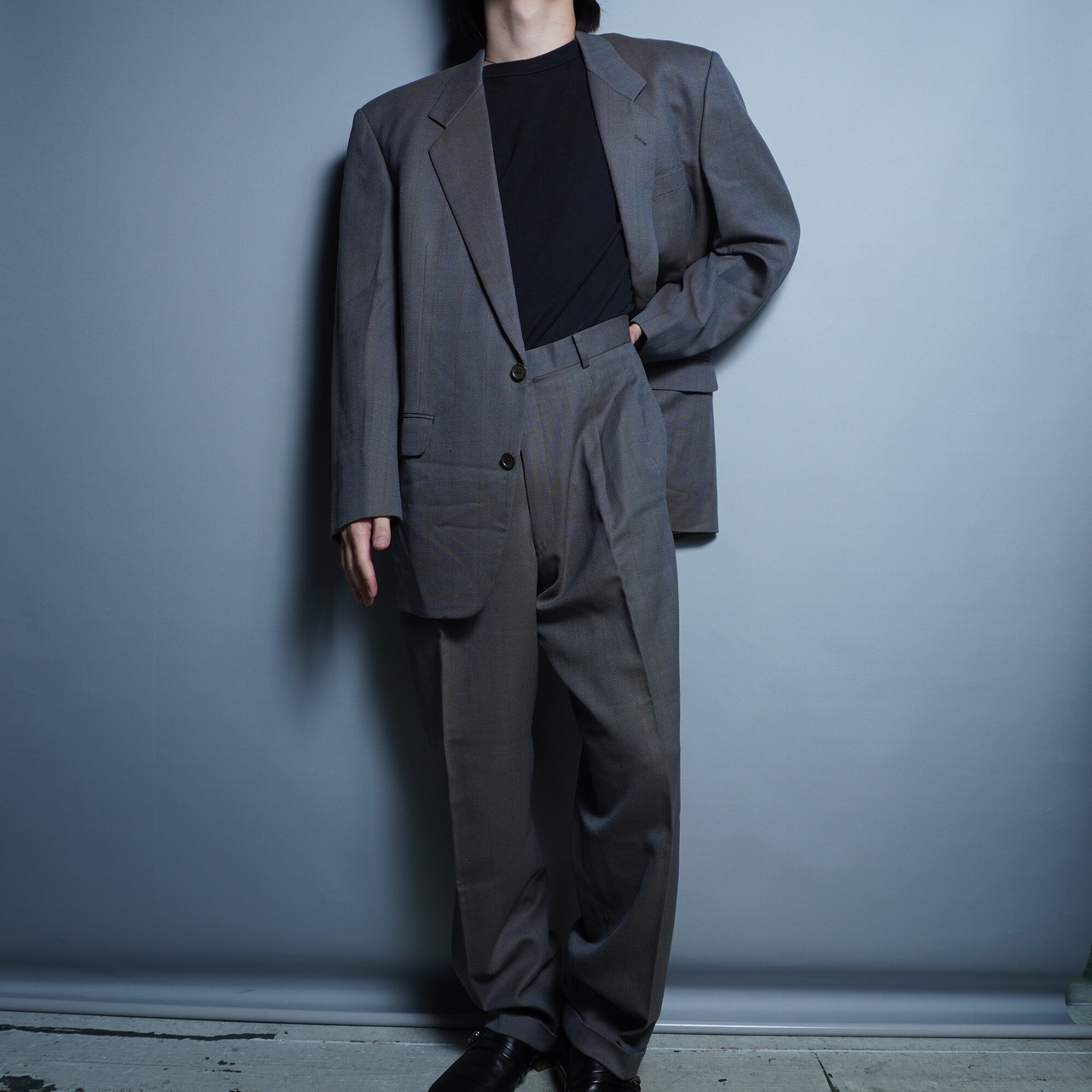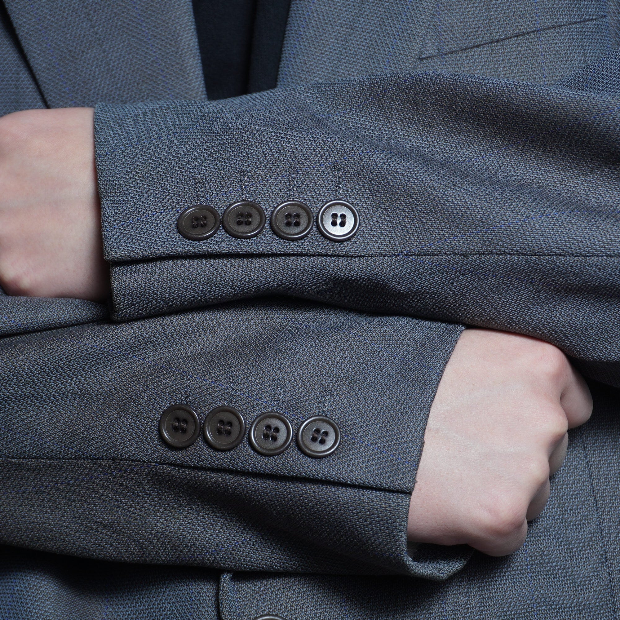 様々な色の糸で織られた玉虫色のようなカラーが特徴的なシングルセットアップ。シンプルなグレーでは無い分、デザインが利いていて面白い一着です。