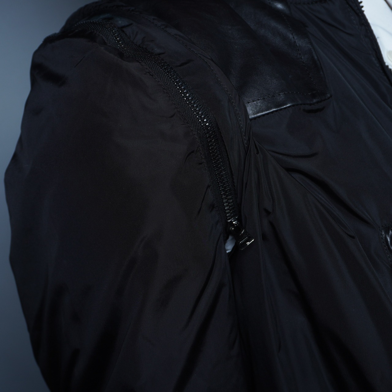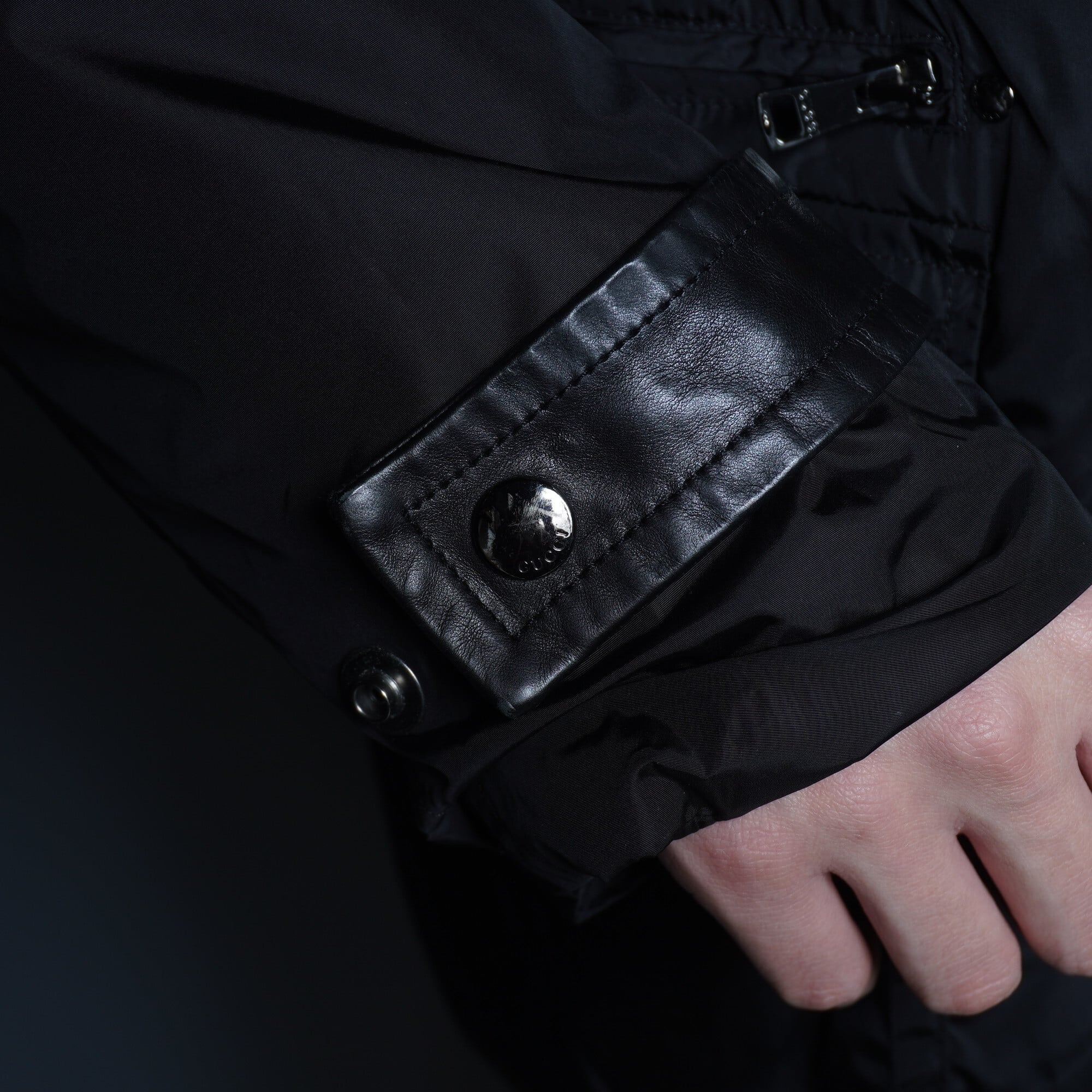 2009年秋冬に発表されたグッチのアーカイブアイテムです。このジャケットは、ナイロンとレザーを組み合わせた素材使いが特徴で、ギミックが施されたユニークなデザインが目を引きます。ブラックカラーで、グッチらしい高級感とデザイン性が感じられる一着です。