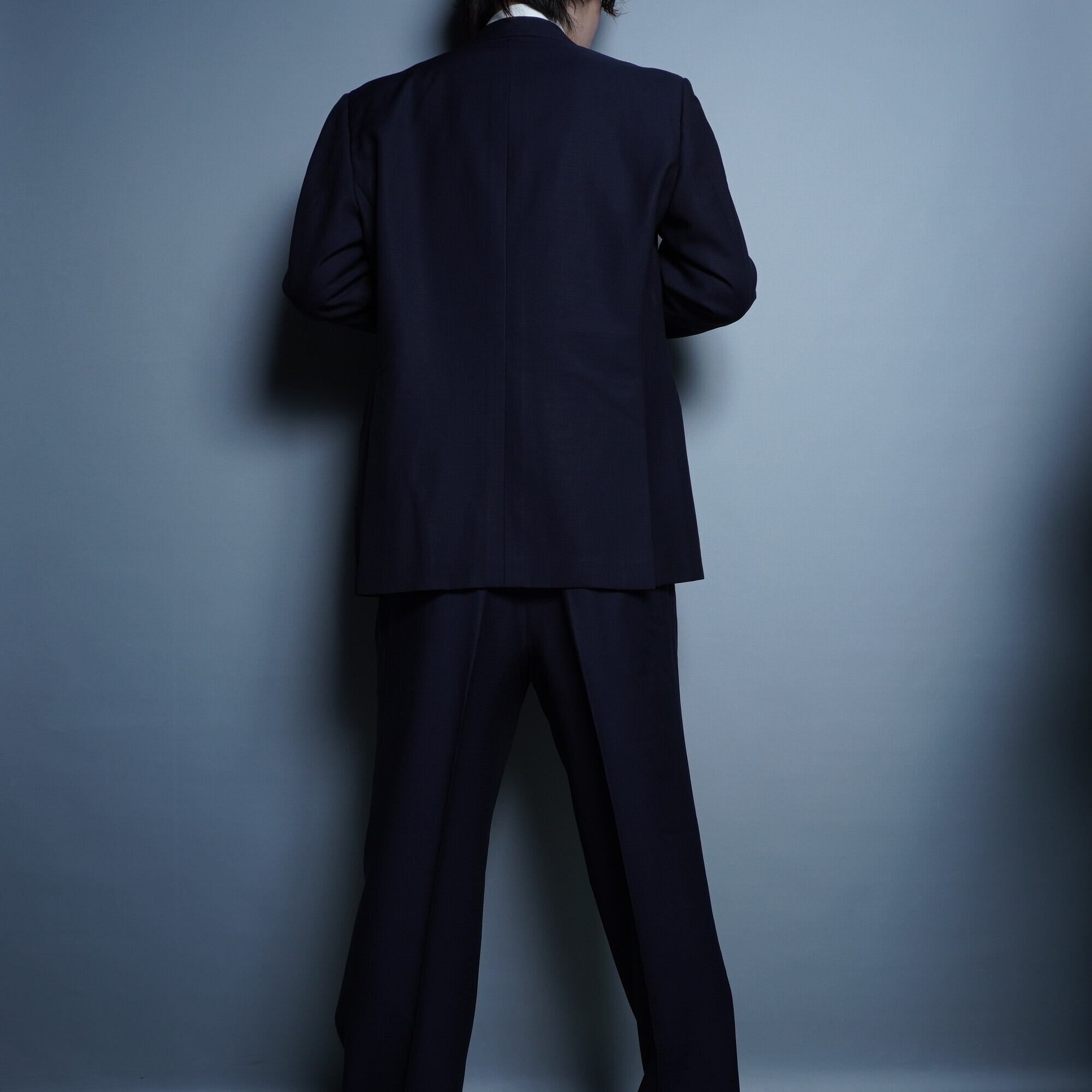 高級感のあるハリと光沢が印象的なダブルセットアップスーツ。ボタンは人気のあるメタルボタンが採用されており、品質とデザイン共に文句なしの逸品。